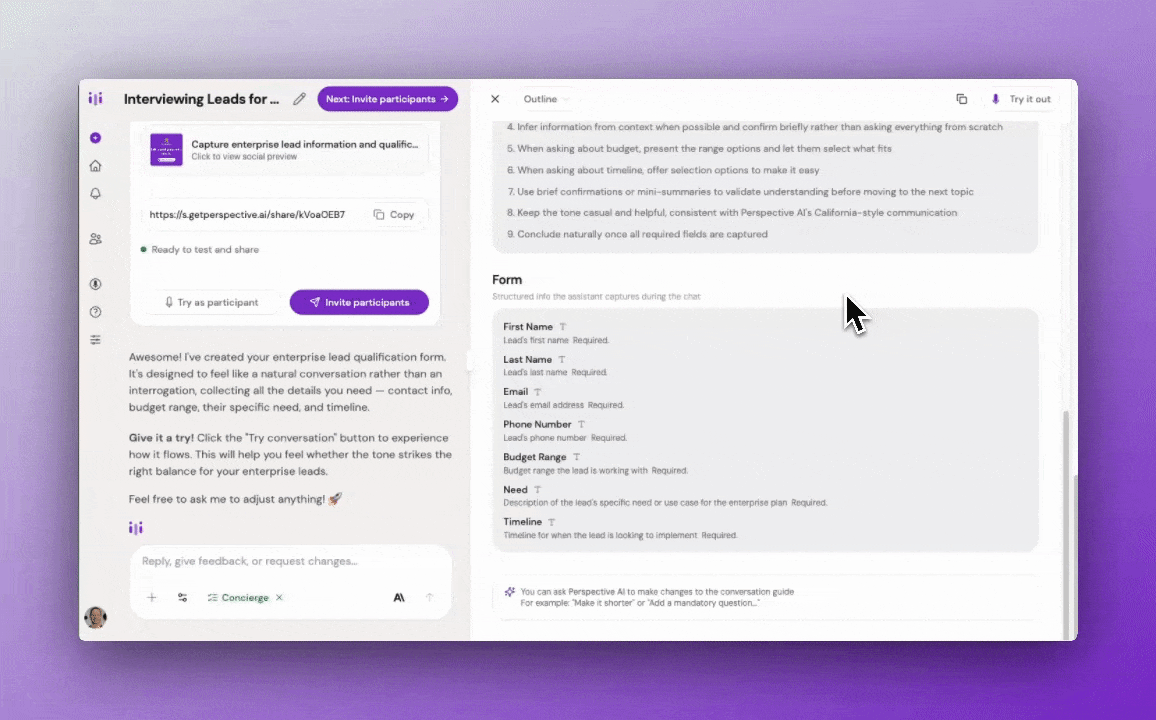 - Start using natural language to interact with Perspective: "Create a new interview outline for customer discovery" or "Pull all responses from the Q3 research outline and summarize key pain points"