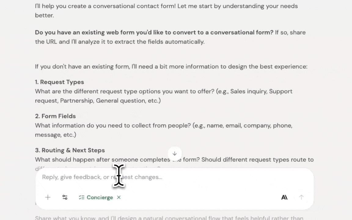 The Concierge agent replaces static forms with conversational experiences that infer what they can and only ask what they must. It uses an infer-and-validate approach—pre-filling obvious details and progressively narrowing questions based on responses.